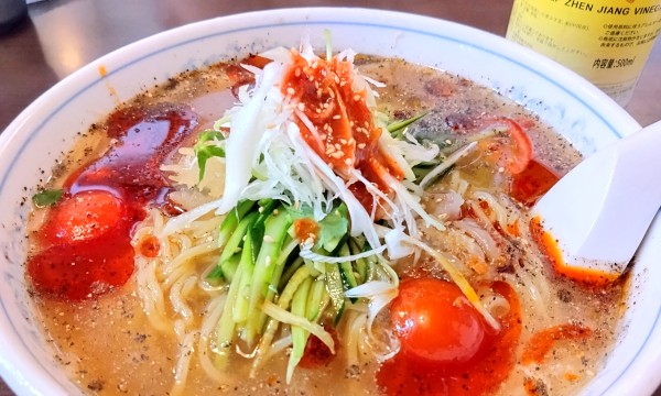 爽やかで、ラー油とコショウでパンチのきいたスープがとてもイイ。地元産の完熟トマト、きゅうり、クラゲのトッピングがシャキシャキ&コリコリで食感楽しく。この美味なるスープでいただくキリッと締まったツルツル麺がウマイ。夏の逸品でした。