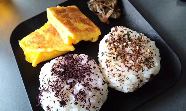 今朝の気分はご飯だな~ということで、おにぎりモーニングを作成。ゆかりとおかかの2種類のおにぎりに卵焼き、漬物を添えて。あ~、日本茶とおにぎりがおいしいなあ…。