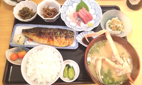 あら?今日はあら汁じゃなくてカニ汁なのね。でもおいしいからOK!焼き魚は鯖をチョイス、大きくて身がふっくらで脂のり良し。新鮮お刺身は3種類、どれもおいしい。