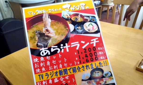 鮮魚店のやっている「あら汁ランチ」が人気のもよう。今日はフンパツして焼魚・お刺身セットを、焼き魚は3種類から選べました。