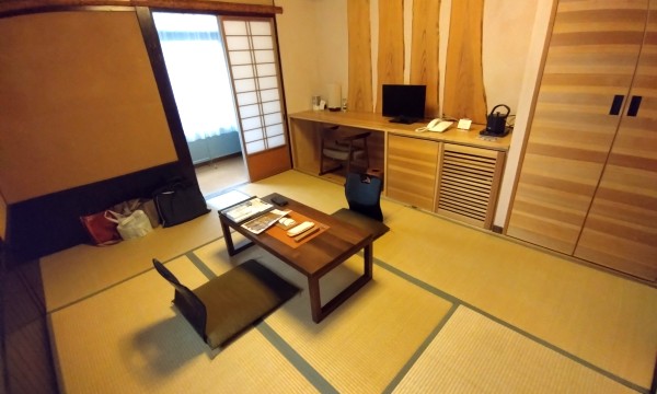さて、チェックイン手続きの後はお風呂の案内と説明を受けて、部屋にご案内~。シンプルながら和モダンな家具や小物が置いてあり、落ち着く雰囲気です。さて、早速貸切風呂に行ってみますか。