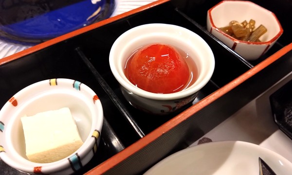 八寸には枝豆の豆腐、トマトのお浸し(ちょっと違うかも、旬のトマトが美味しかった!)、ふきの煮物。