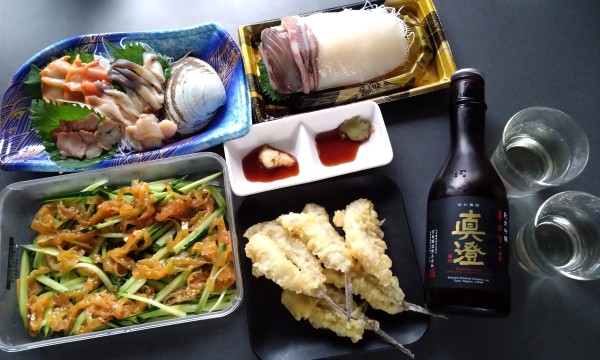 今日はこんな感じの夕飯になりました。貝づくしの刺し身、イカ刺し、こち(だったっけ?)の天ぷら、中華クラゲのきゅうり和え。