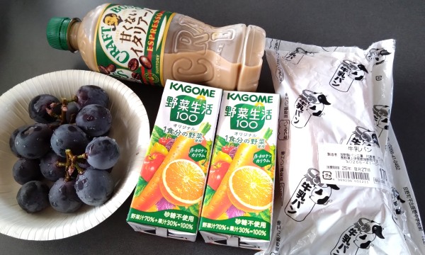 工場見学のお土産の野菜ジュースに、角上魚類で買った巨峰、そして牛乳パン。