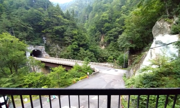 宿の眼の前を走るのは、上高地に向かうバスや岐阜の高山方面に向かう車がビュンビュン行き交う国道158号線。このお宿は、トンネルとトンネルの間わずか66メートルの道路の奥にある一軒宿なんです。