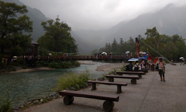 バスセンターから河童橋まで歩いて6分、あっという間に空が陰って雨が落ち始めました。我々が泊まるキャンプ場まではさらに歩いて5分、急げ~!