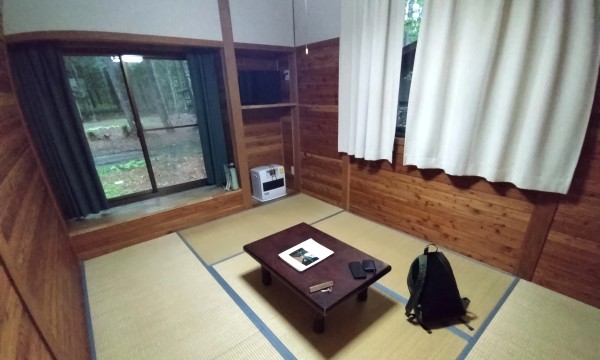 我々がお世話になるのはB型ケビン。6畳和室にキッチンつき、冷蔵庫なし。エアコンはもちろんなくて、ヒーターあり(売店で燃料を買う必要あり)。キャンプ場でも奥まった場所にあるので、電波はギリ。トイレは歩いて1分の場所にあり。