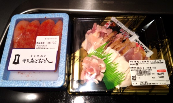 早速、九州っぽいモノ買っちゃうぞ~。ということで「博多あごおとし」明太子と鶏のたたきセットをゲットしました。