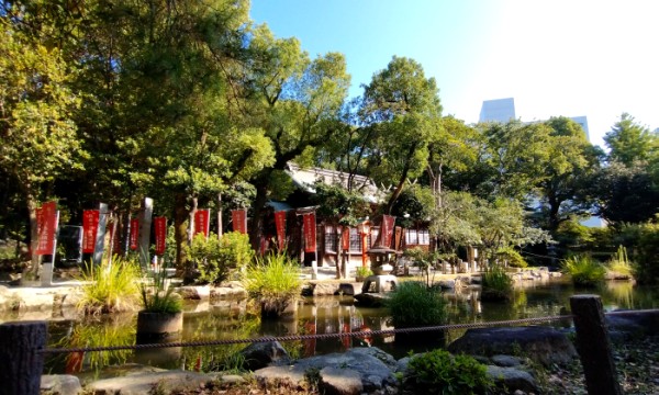 小さなビルが並んでいる静かなエリアを歩いていくと、古めかしい鳥居が見えてきました。住吉通りを横断して境内に入ると、最初に見えたのが摂社の「三日恵比須神社」。池が涼しげ、そして日差しが夏(笑)