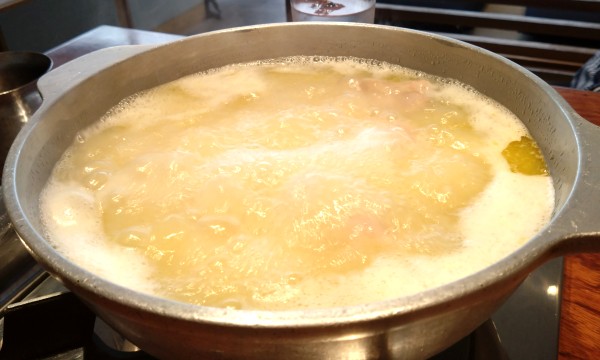早速席に通されて、おしゃれな前菜をいただきながらビールで乾杯。水炊きはお店の人が面倒をみてくれます。沸き立つ黄金色のスープ、おいしそう。まずはカップに取ってもらったスープをいただきます。うんうん、いい味。