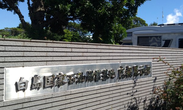 それは駐車場から1キロのところにある「白島国家石油備蓄基地 白島展示館」。 海の写真の矢印で指しているのが「白島」、そこに ”国家石油備蓄基地” があるそうです。