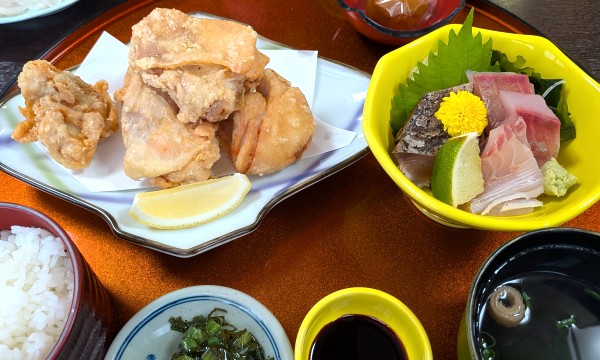 からあげにセットの刺し身3点も新鮮でおいしく、大満足。ちょっとお高めかなと思いましたが、どちらもボリューム満点で美味、満足度が高かったです。おいしくて食べすぎちゃった~(笑)