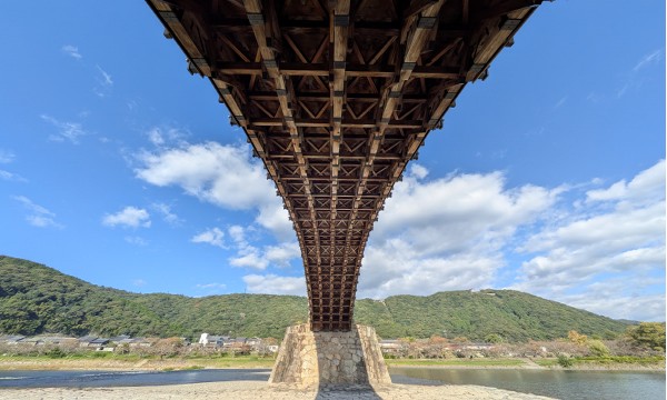 河原に降りて真下から撮影。「錦帯橋」は日本三名橋に数えられる国内屈指の5連アーチの木造橋です。構造美!