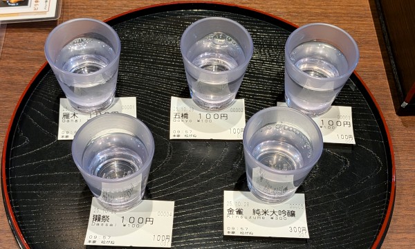 岩国の地酒を5種類飲み比べです。純米吟醸の「雁木」「五橋」「金冠黒松」、純米大吟醸の「金雀」「獺祭」。1杯30mlで100円が4種、300円が1種。Pが一番気に入ったのは、すっきり辛口の「五橋」だそう。