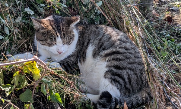 そして枯れ草に埋もれてスヤスヤとお休みの猫。そ~っと近づいて撮らせていただきました。君たち、いいところにお住まいやね。