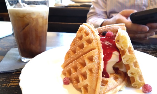 お天気がよい中歩いたので、アイスコーヒーが美味しいね。そして「ブルーベリーアイスクリームワッフル」をシェアしていただきました。焼き立てで表面さっくり中フワフワのワッフルに、ブルーベリーソースとアイスをのっけて♪ん~、幸せじゃ。