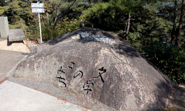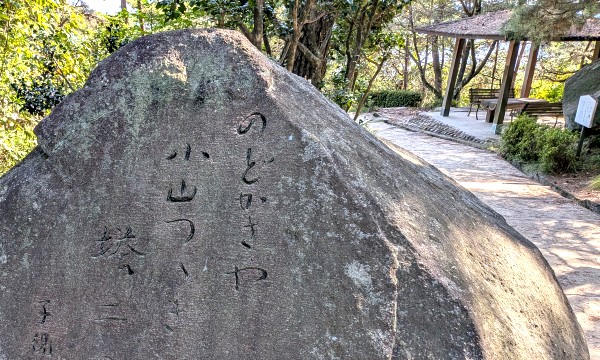 とちょっぴりさみしく思っていると、山頂駅近くに見つけた大岩に見覚えのある「文学のこみち」の文字。あっ!ここ覚えてるよ。