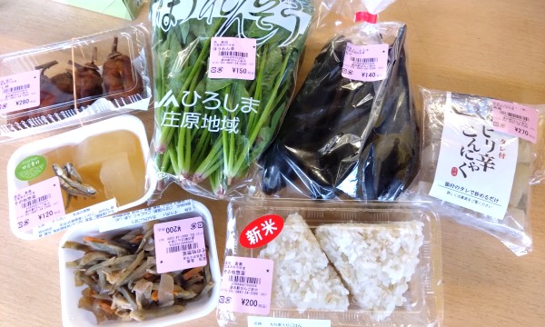 野菜も仕入れたいけど、今日は朝ごはんも買いたいんだな。と思ったら、いい具合におかず、そして新米のおにぎりが買えました。この節、米が高騰しているというのに新米おにぎり2個で200円、ありがたいねえ。それから新鮮野菜と干し柿、地元産のこんにゃくもゲット。