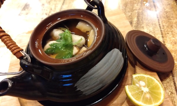 やってきました刺身盛合せ、800円なり。えっ、6種類もあって嬉しい!そしてどれも美味しいわあ。えーと、次はなにを食べようかなぁ。刺身を食べるとお腹があったまるモノが食べたくなるということで、黒板メニューにあった「土瓶蒸し」をオーダー。