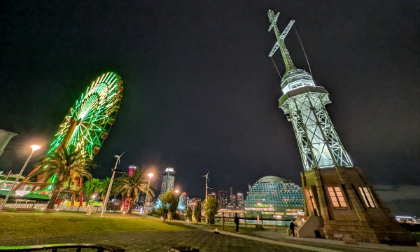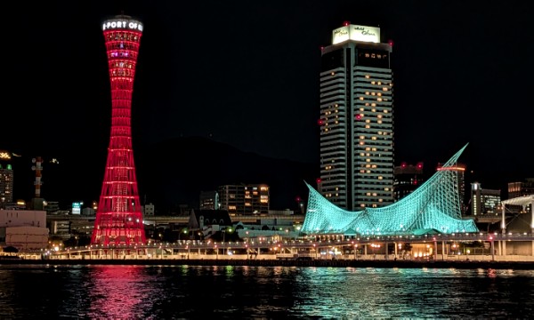 「モザイク大観覧車」(前掲の写真左)の前の開けた場所まで行ってみると、すばらしい夜景が広がっていました。「神戸ポートタワー」の赤と「神戸海洋博物館」のグリーンのコントラスト、キレイ!