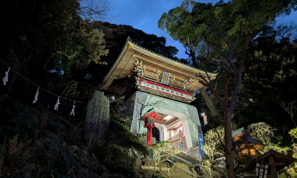 暮れかかった江の島の商店街を抜けて、まずは「江島神社辺津宮」に参拝です。