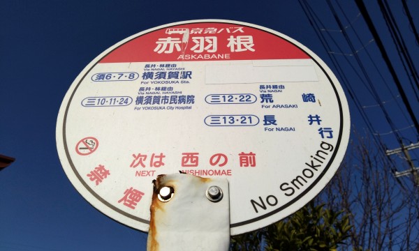 そして今日は、バスで横須賀観光へ。バス停はRVパークから歩いて約6分のところにある京急バス「赤羽根バス停」、ここから横須賀駅方面にむかうバスに乗ることができます。