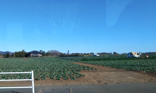 車窓の景色。住宅が途切れると一面に畑、のんびりとした風景が広がっています。無人販売に並んだ三浦大根、美味しそうだなあ。