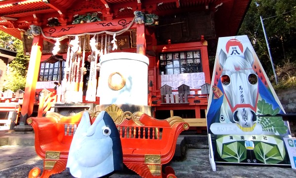 由緒由来を記した縁起書によると、藤原貴族の系統である藤原資盈公(ふじわらのすけみつこう)、盈渡姫(みつわたりひめ)の夫婦が三崎の地に流れ着いたことが、当神社の起こりです。資盈公は二年という短い期間に、海賊の平定、教養の普及などに努め、この地の文化の礎を築いたとされます。(海南神社ホームページより)