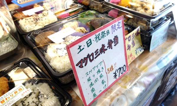 それからお弁当やお惣菜を販売しているお店で、土日祝限定の「マグロ三昧弁当」をゲット。マグロの料理が5種入ったお弁当だって、これはランチ用に買おう。