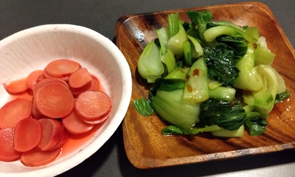 今夜の車中飯:チンゲンサイの湯引きとラディッシュ漬け