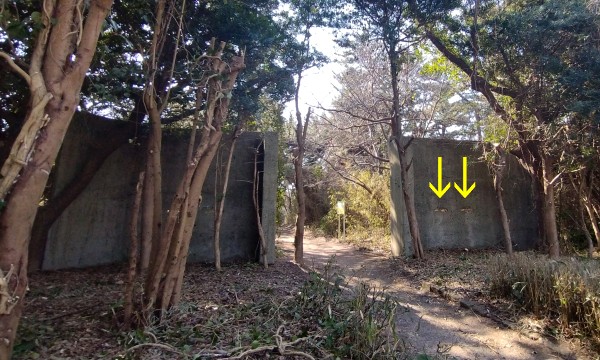 第1駐車場から歩き出して、第2駐車場の向かいにある公衆トイレの脇を南に歩いていきます。見えてきたのはコンクリートの塀。中央に門扉でもあって、昔は何か施設の入口だったのかな?という感じですが、これは「監的塀」。