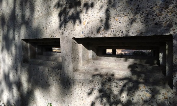 説明によると、「鉄筋コンクリート製の一対になった防弾壁。50m先の射入窖(しゃにゅうこう)に向け試射し、中央にある観測窓から速度や威力を確認した」と。ひとつ上の写真の矢印下にあるポストのような口はそういう目的のものなのかあ(写真は反対側から見たところ)。