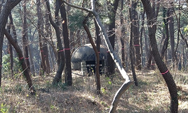 いったん道路に戻って、今度はジャンボプールの向かいの歩道から林の奥に見える「監的所」をパシャリ。こちらの説明には「火砲の命中試験の際に中央にある観測窓から着弾の様子を確認した」と。