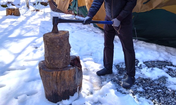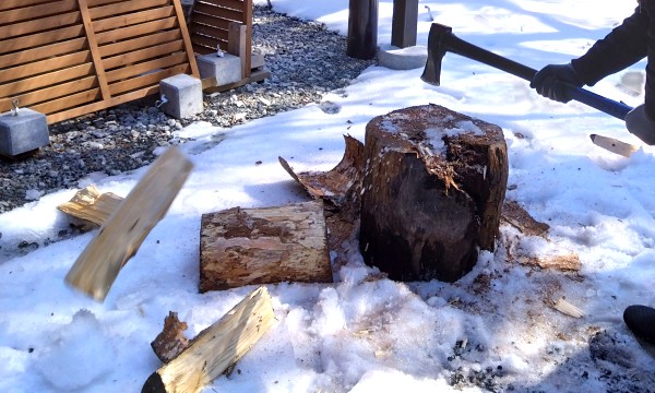 薪割りを見守りながら、ちょっとキャンプ場の人とおしゃべり。雪は3日前にたくさん降ってようやくここまで溶けたとか、以前利用した薪ストーブのあったコテージは今はピザ窯が設置されているとか。焼き立てピザかぁ、いいなあ。