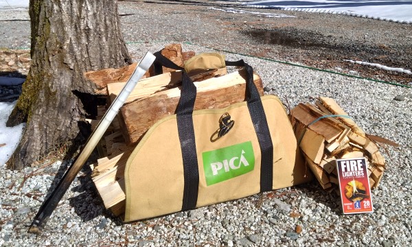 1つの丸太を割るとこんな量になるんですなあ。薪を運ぶバッグと火ばさみは無料で借してもらえます。「焚火RESORT PICA」プランには自分で割った薪のほかに、針葉樹の焚き木1束と着火剤がついてきます。自分たちで持ってきた薪もあるし、これで焚火時間を満喫できるぞ~。