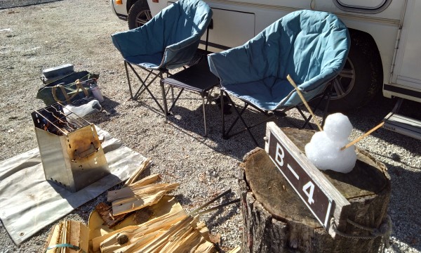 焚き火シートに薪グリル、椅子にテーブル、セット完了。小さな雪だるまも添えました(笑)今日は快晴、日差しがまぶしいくらいです。いや、気持ちイイね!