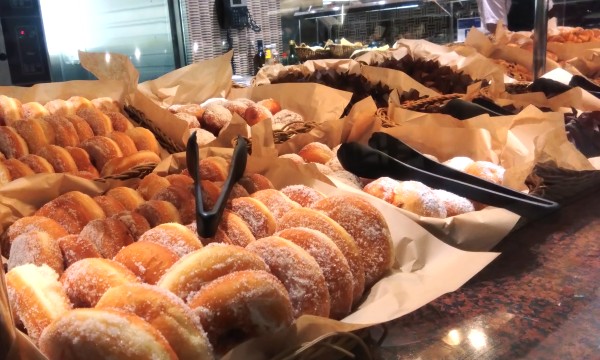 うわー、朝から美味しそうでキケンなのが並んでるわー。パンの種類がめっちゃ豊富で、たまりませんなぁ。めちゃめちゃ広いビュッフェ台、くるりと見て回ると日本食コーナーと中華っぽいコーナーあり。今朝の気分はコレかな。