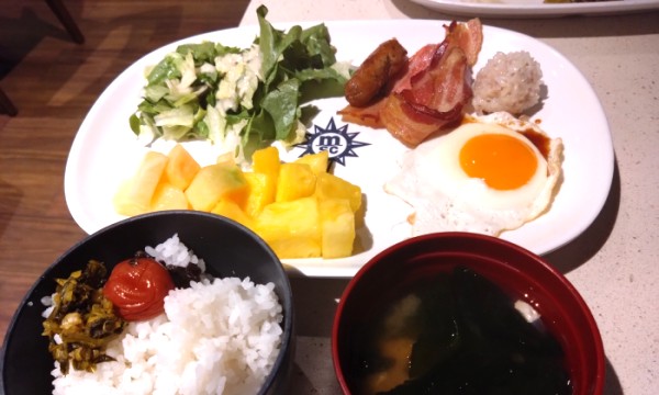 はい、目玉焼き和朝食でございます。ご飯にのっけた梅干し、かなりウマイ&目が覚めるぅ。あとは野菜にフルーツ盛り盛りで。