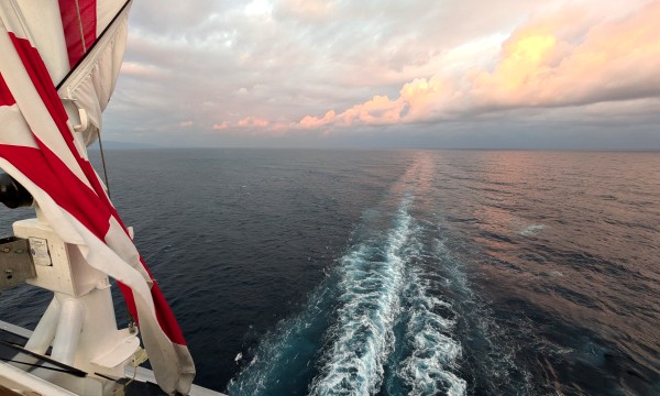 朝食を食べているあいだにすっかり明るくなったので、食後はそのままデッキ15前方へおさんぽ。