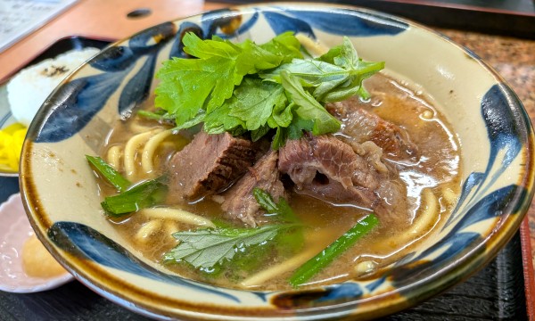 牛の出汁がめちゃおいしい、そしてよく煮込まれたゴロゴロ牛肉がまたうまし。麺は沖縄そばと違った黄色みのある丸い太麺。うーん、あとをひく美味しさだなあ。薬味のフーチバー(よもぎの一種)もいいし、言えばつけてくれるニンニクがまたよく合います。