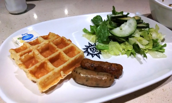 よっしゃ、まずは朝食じゃ。とデッキ(=階)15の「マーケットプレイスビュッフェ」へ階段で。我々のキャビンはデッキ14なので近いんですよね~、食事のほかにも飲み物を取りに行ったりするのでとっても便利です。