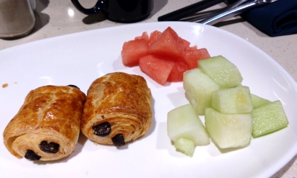 食べたら食欲が出たので、おかわりを取りに。大好きなパン・オ・ショコラとフルーツをいただきま~す。あ、食事終わったのねPさん、コーヒー取ってきてもらえますか~?