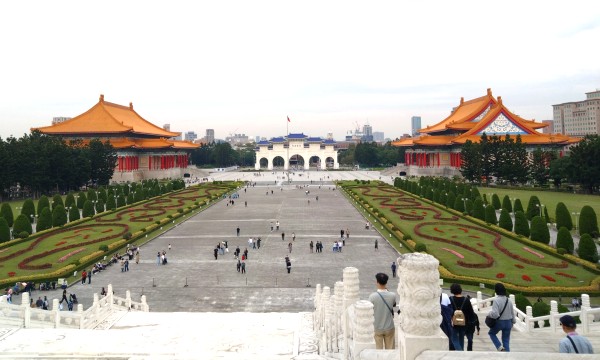 中正=蒋介石(中華民国初代総統)の顕彰施設である「中正紀念堂」、台北の観光名所のひとつです。中国の伝統的な宮殿陵墓式を採用して建設され、高さ70メートル(ビル17階分)ととにかくデカイ。