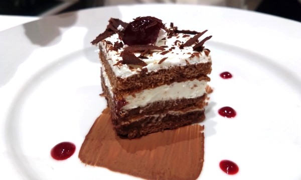 デザート:チョコレートケーキ(ほどよい甘さでおいしい、ぽっちりと置かれたベリーソースも合う)