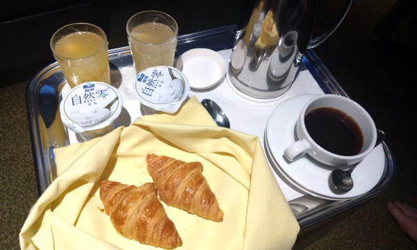 今朝はルームサービスでモーニングを頼んでみました。頼めるのはドリンク、ヨーグルト、パンくらいですが、無料。前夜にリクエストの用紙をドアノブに下げておきました。アップルジュース、ヨーグルト、コーヒー(奥の銀色のポットにいっぱい入ってる)、クロワッサン。