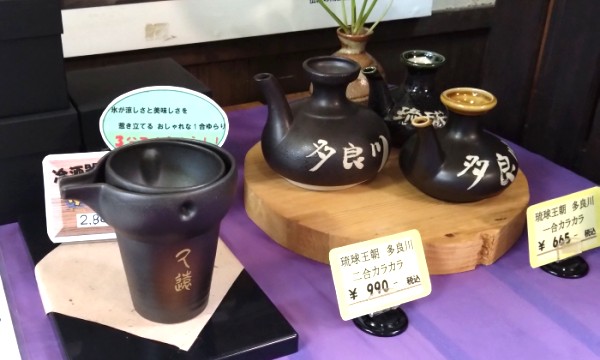 写真左の冷酒器「ゆらり」。上部のカップに氷を入れて下に注いだ泡盛を冷やすというしかけ。しかもカップがゆれて、注ぐ時に氷や溶けた水がこぼれないようになっています。見た目も素敵で機能的、使うのが楽しみだ~。